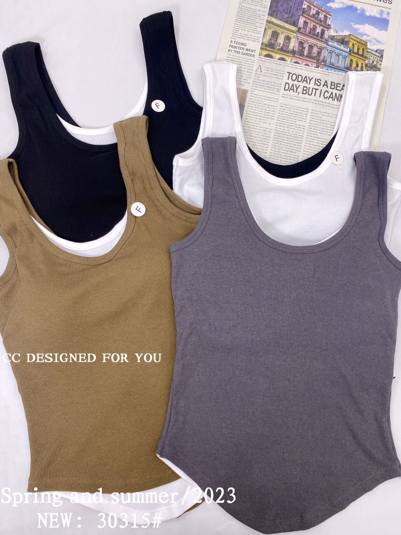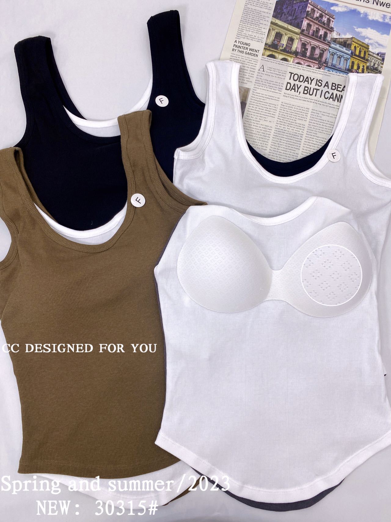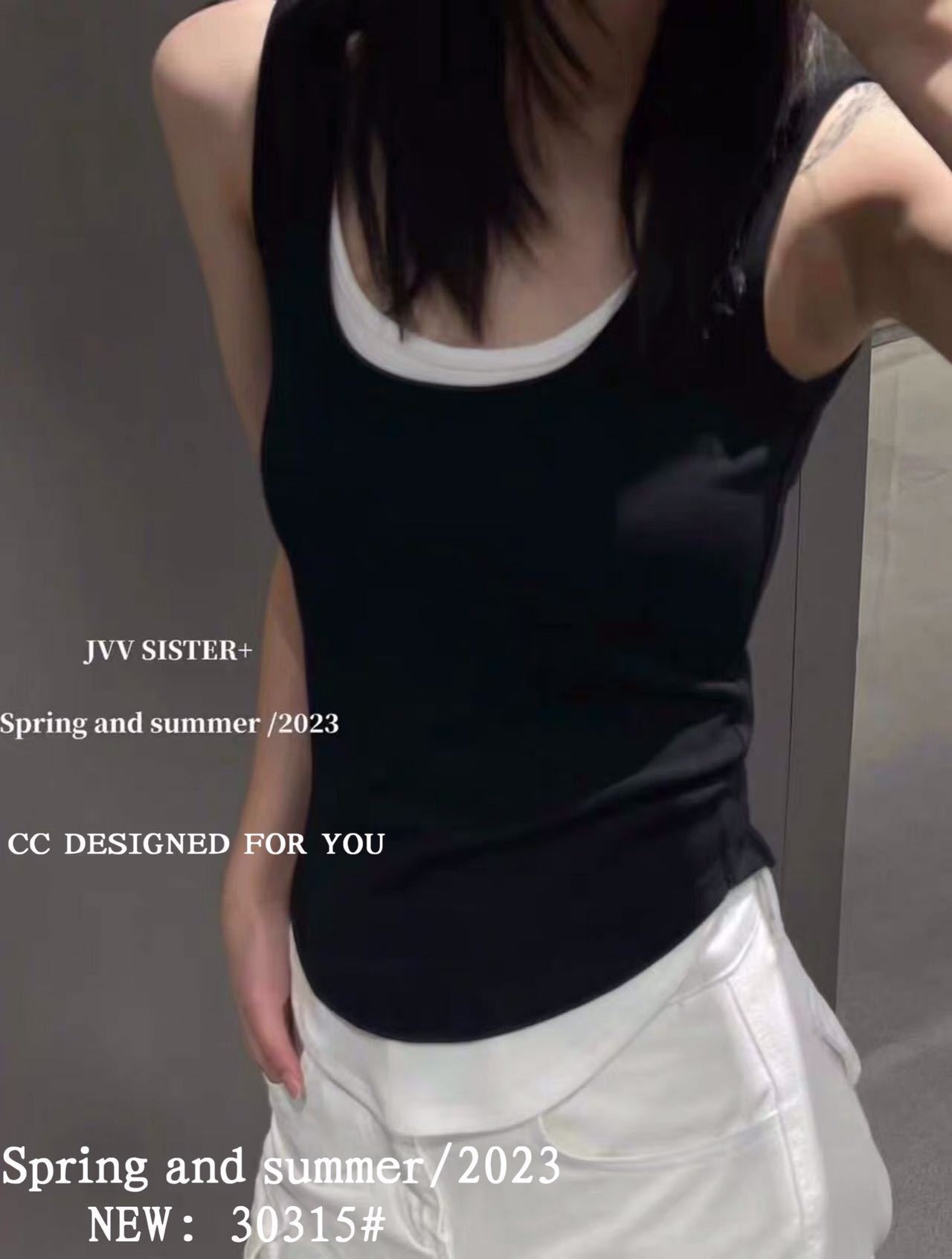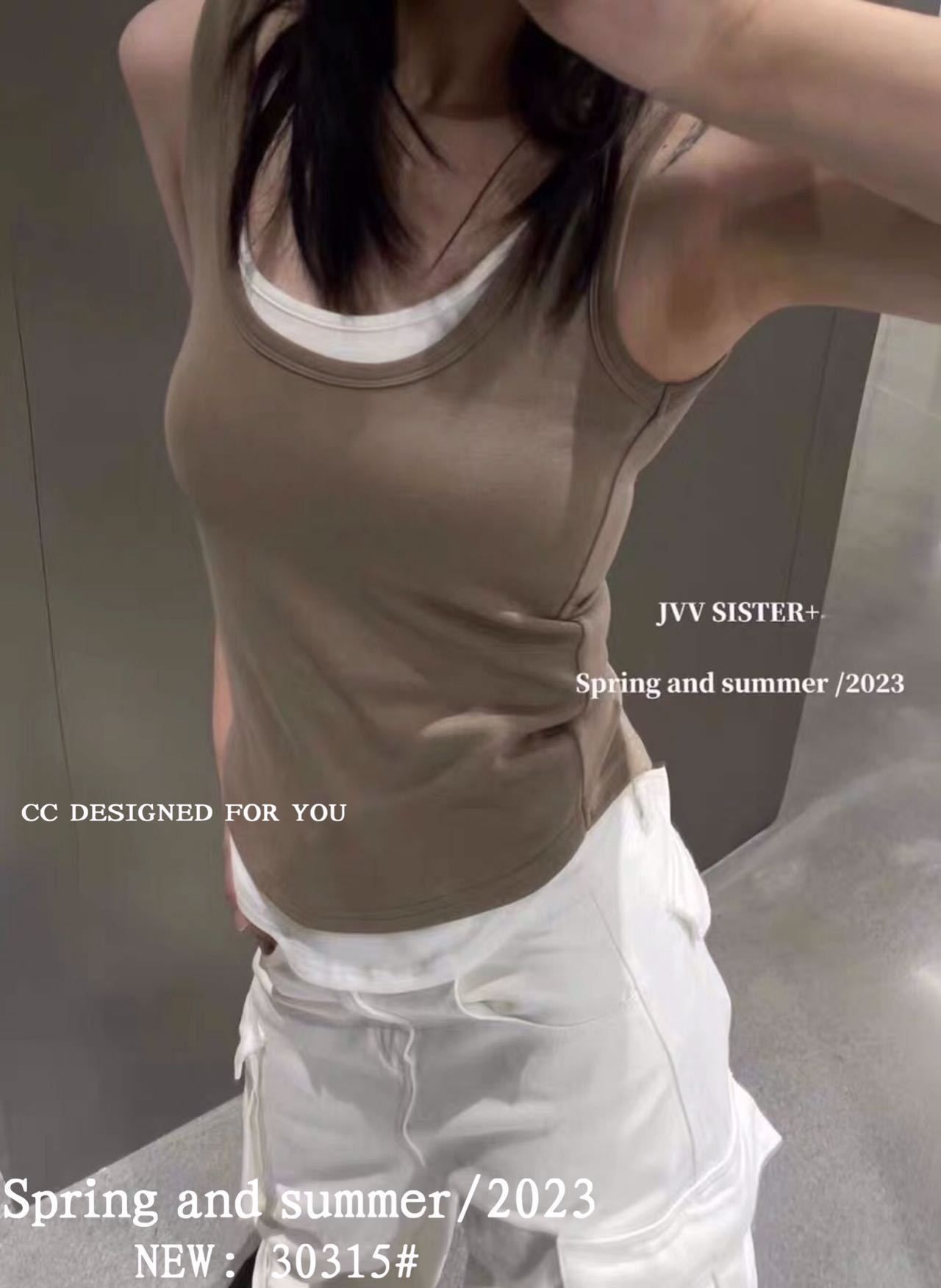 1021#新款甜辣妹假两件螺纹吊带背心弧形下摆设计女 带胸垫
