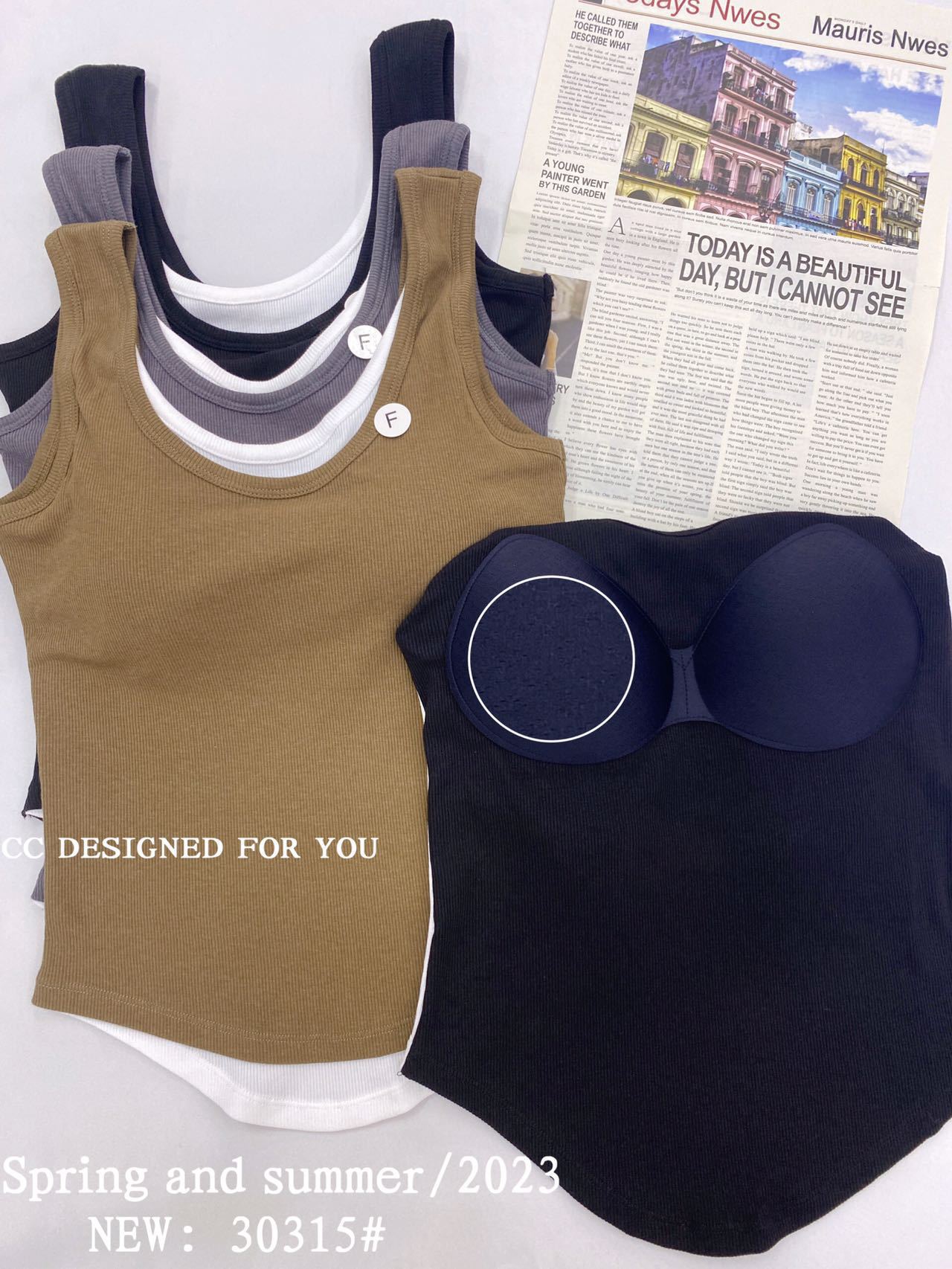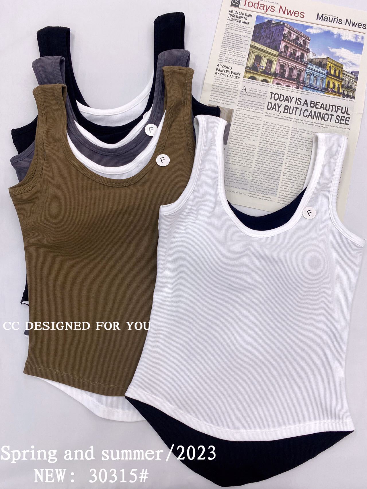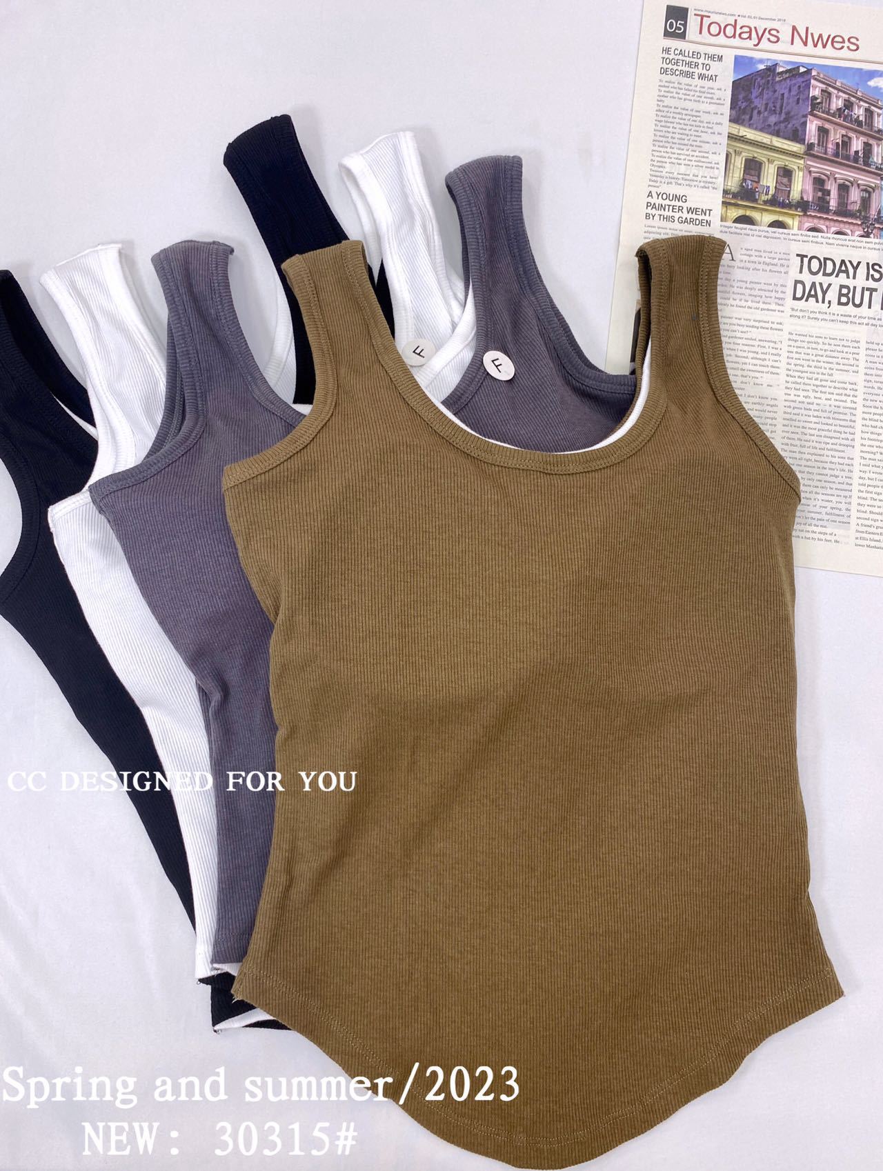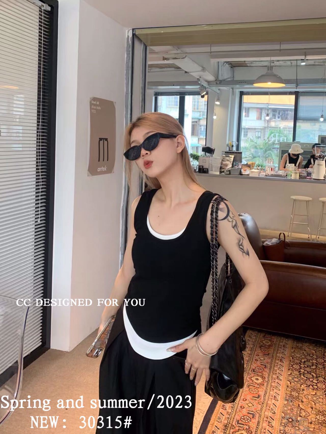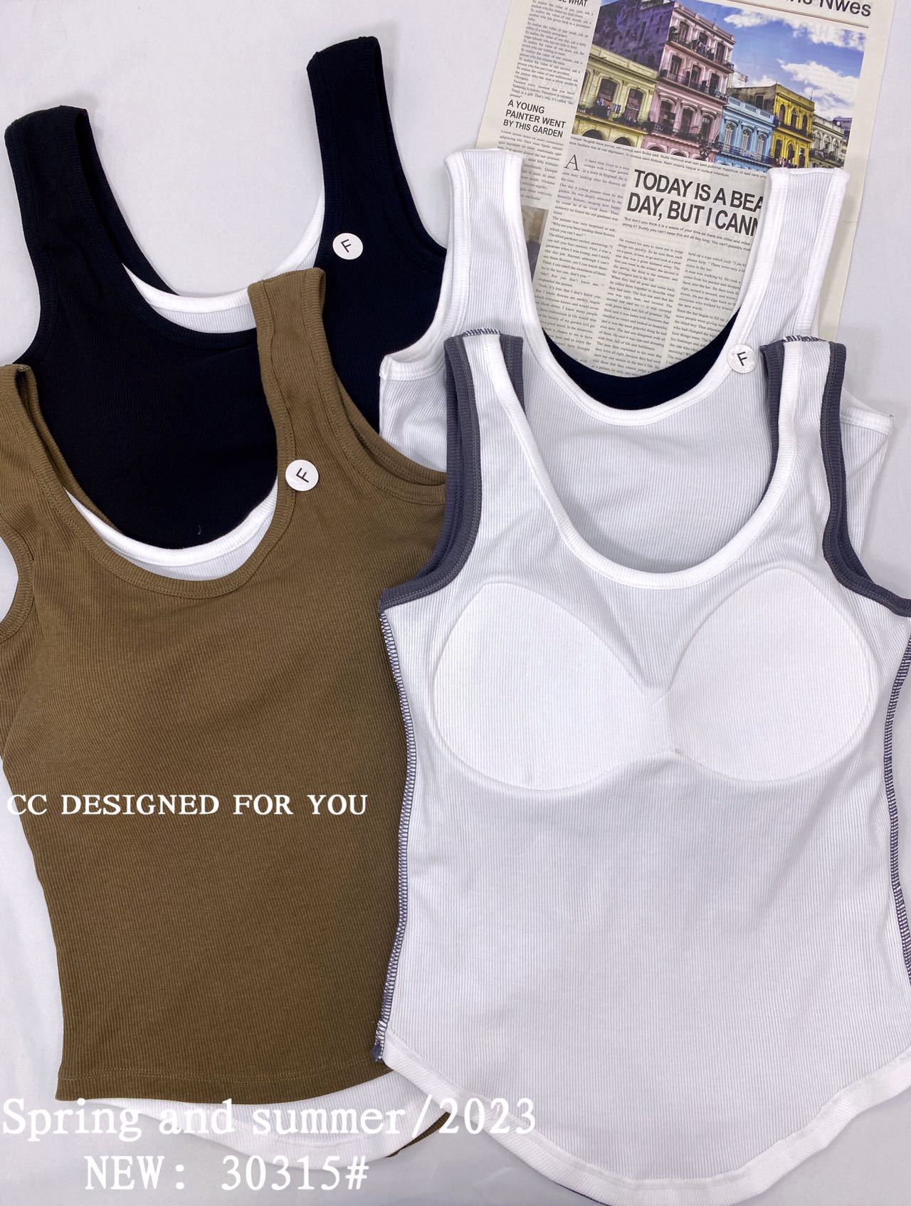 1021#新款甜辣妹假两件螺纹吊带背心弧形下摆设计女 带胸垫