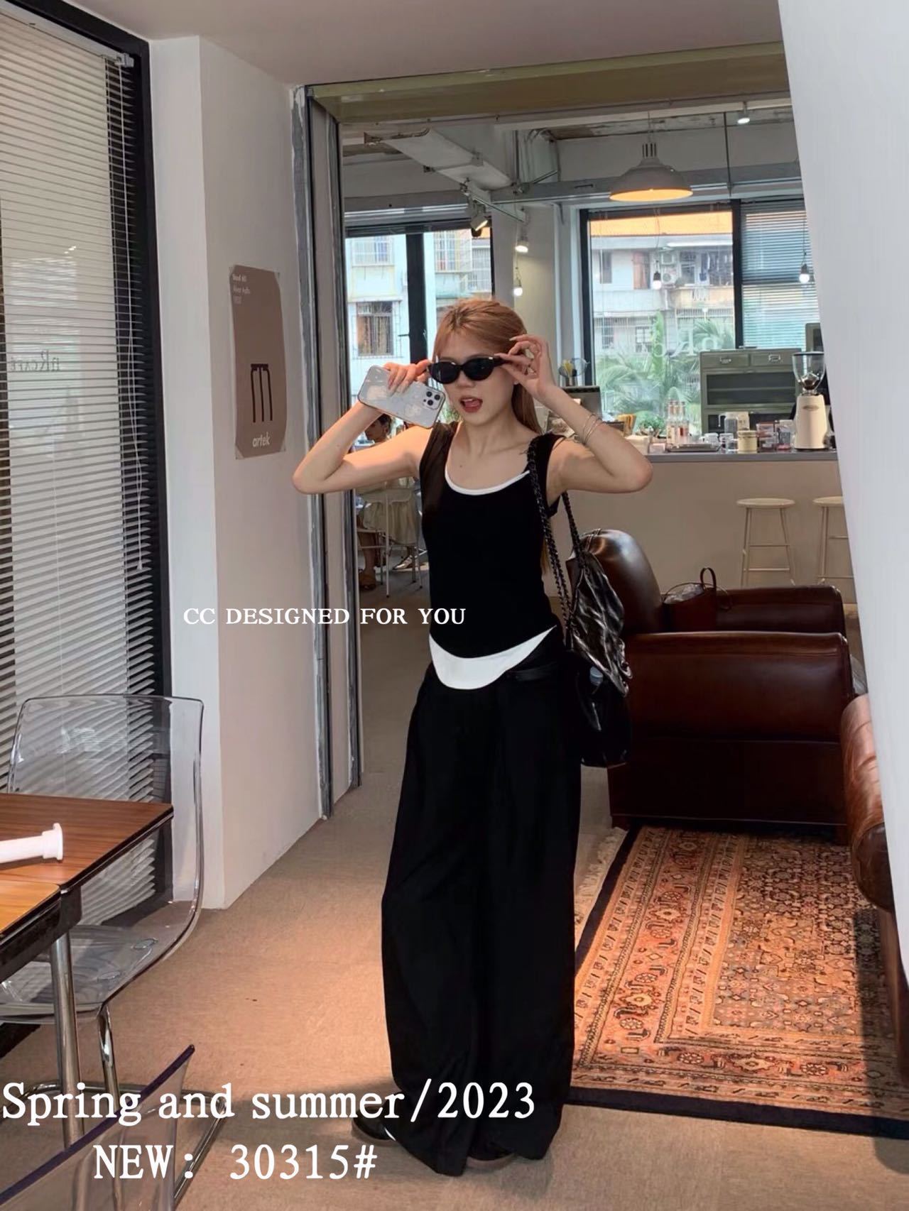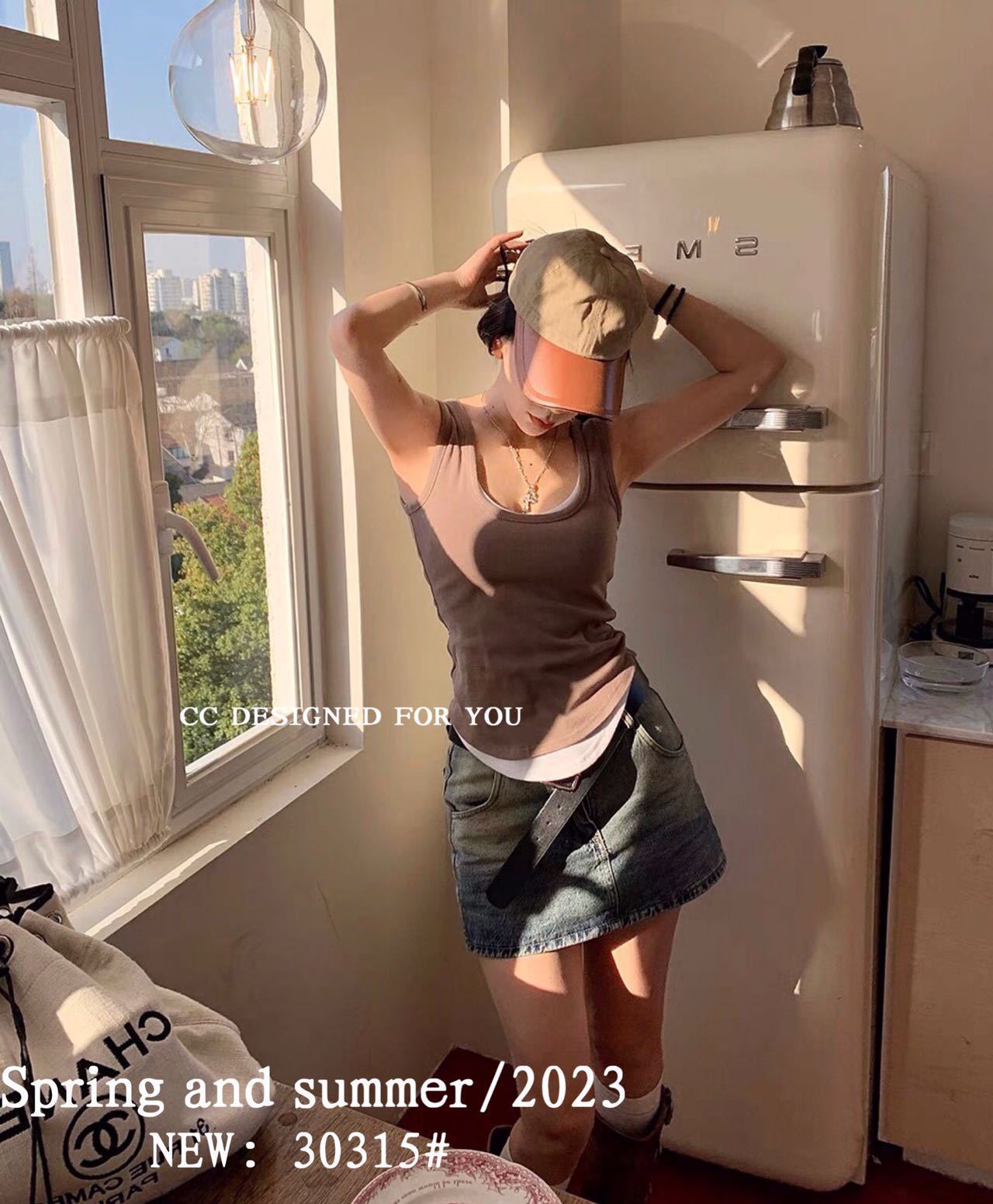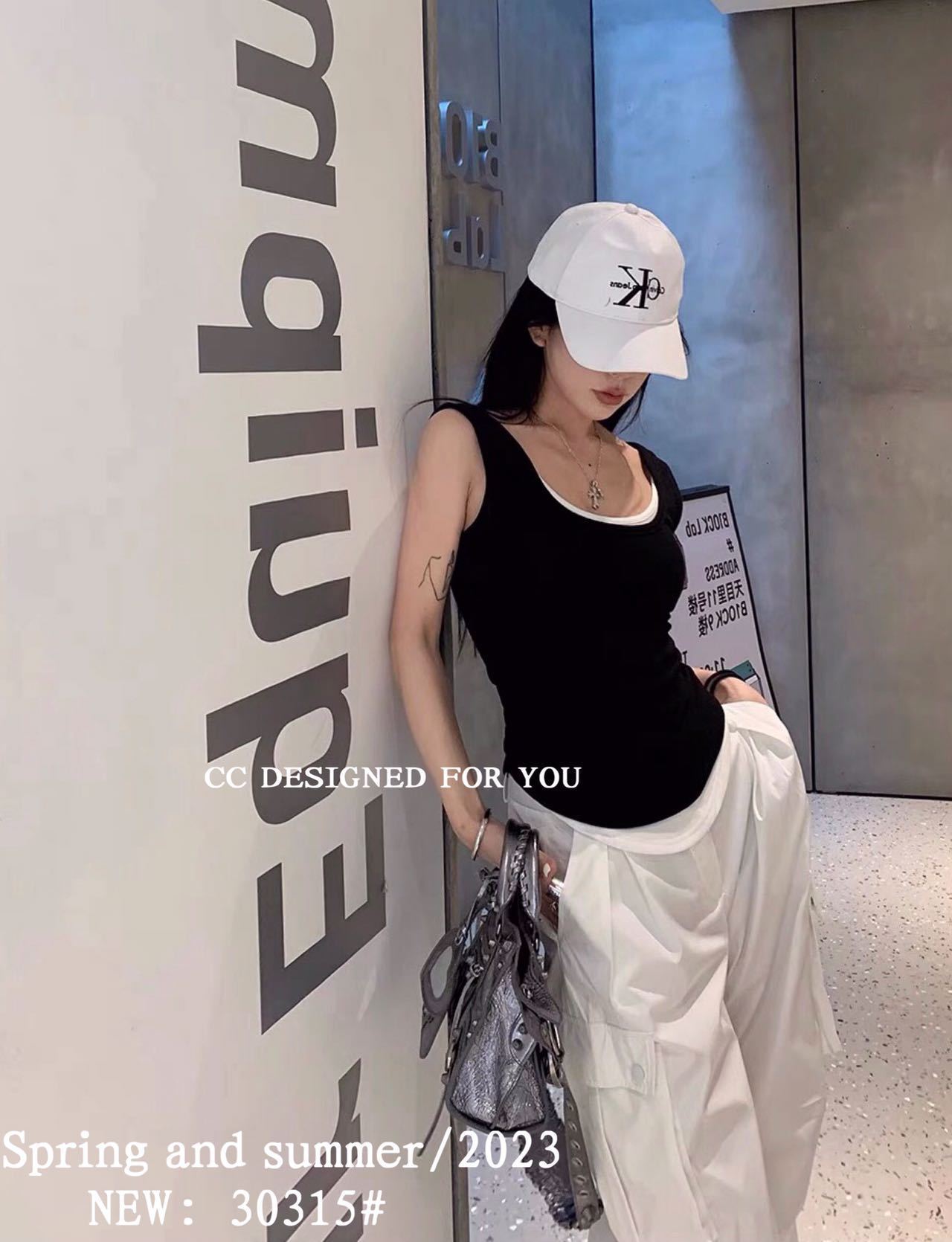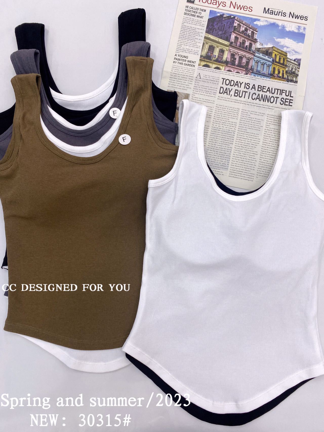 1021#新款甜辣妹假两件螺纹吊带背心弧形下摆设计女 带胸垫
