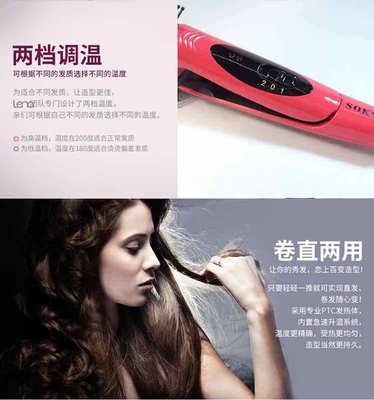 这款SOKANY二合一卷发棒为今年的新款,卷直二合一,红色造型非常亮丽。我们这个牌子在欧美有相当名气,在亚洲日本,新加坡,马来西亚等也非常受欢迎。品质非常好。