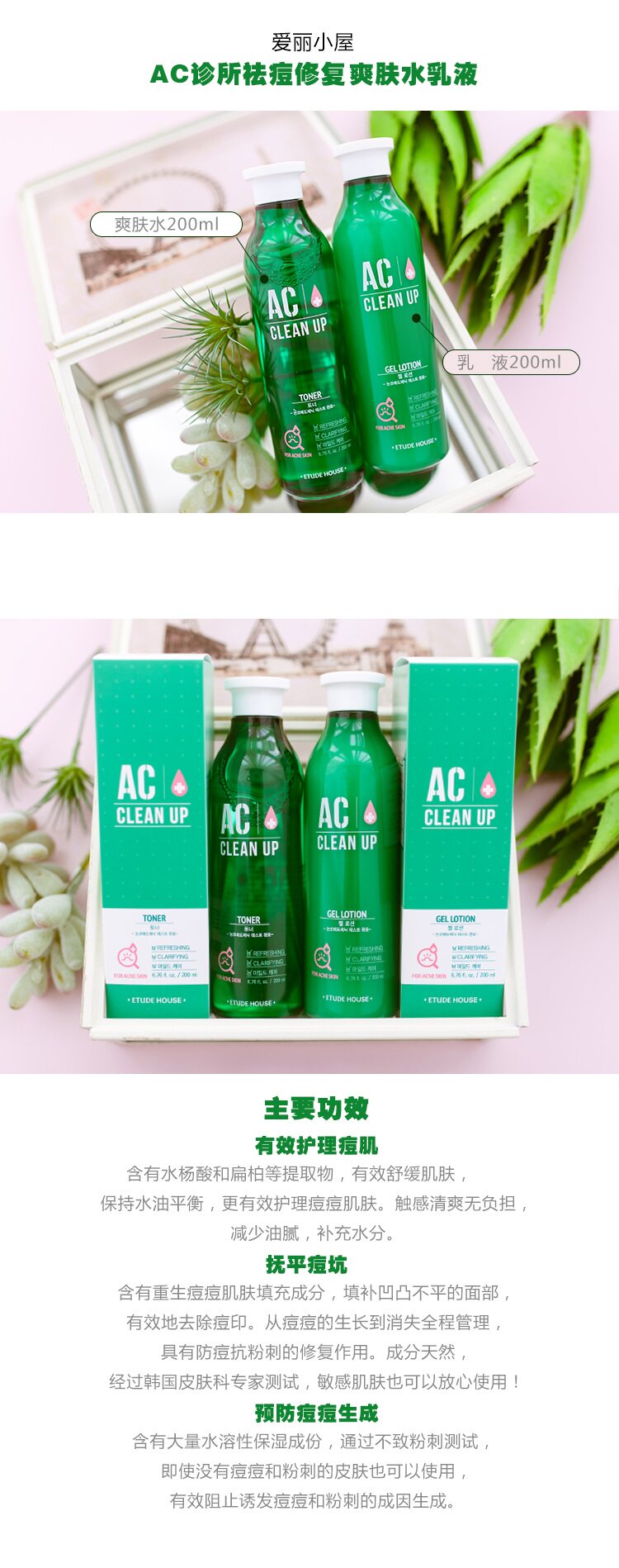 产品名称: Etude House 爱丽小屋AC诊所祛痘修复镇定爽肤水乳液
