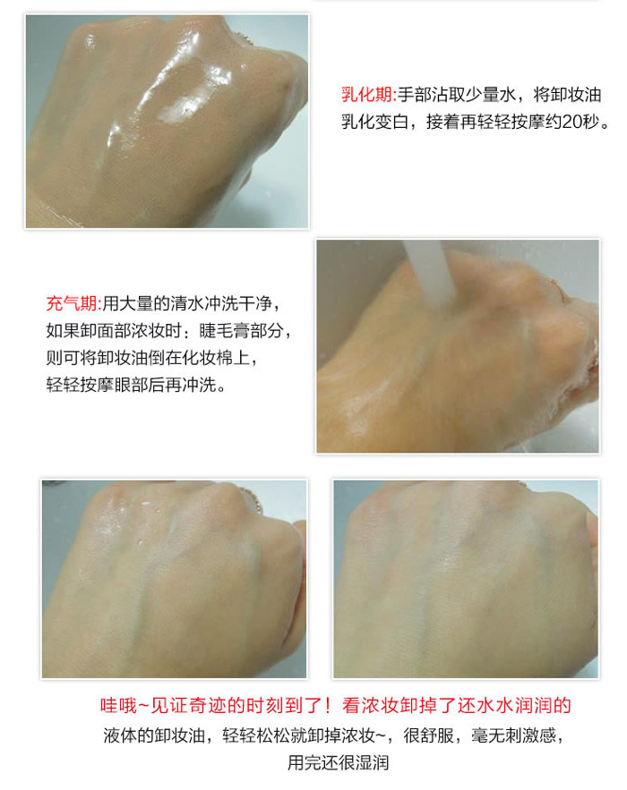 用指腹以画圆的动作溶解彩妆及污垢,时间以1分钟为为限乳化期:手部沾取少量水,将洁面油乳化变白,接着再轻轻按摩约20秒充气期:用大量的清水冲洗干净,至于睫毛膏部分,则可将洁面油倒在化妆棉上,