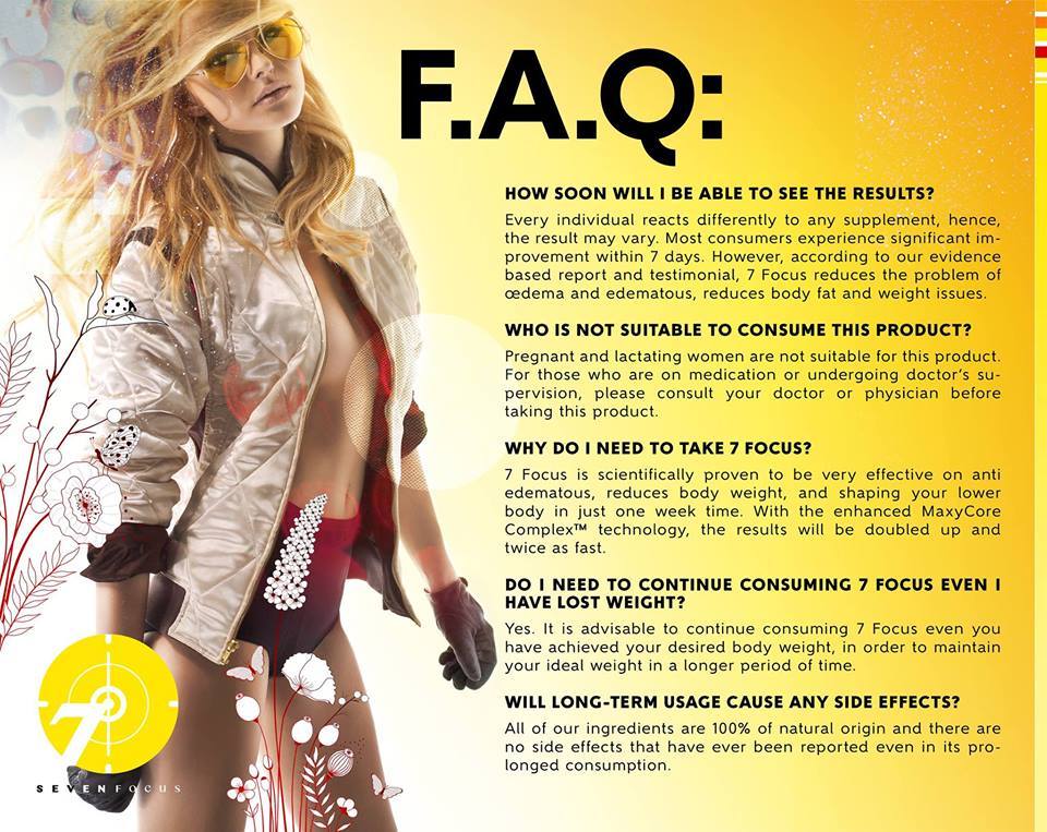 A: Every individual reacts differently to any supplement, hence, the result may vary. Most consumers experience significant improvement within 7 days. However, according to our evidence based report and testimonial, 7 Focus reduces the problem of oedema and edematous, reduces body fat and weight issues. 每一個人的身體狀況和反應都不同,因此其結果也會有所不同。大多數服用者可以在 7 天內體驗顯著的改善。根據我們的統計報告,7Focus 能夠有效的改善浮腫和水腫問題、改善脂肪以及體重過高的問題。