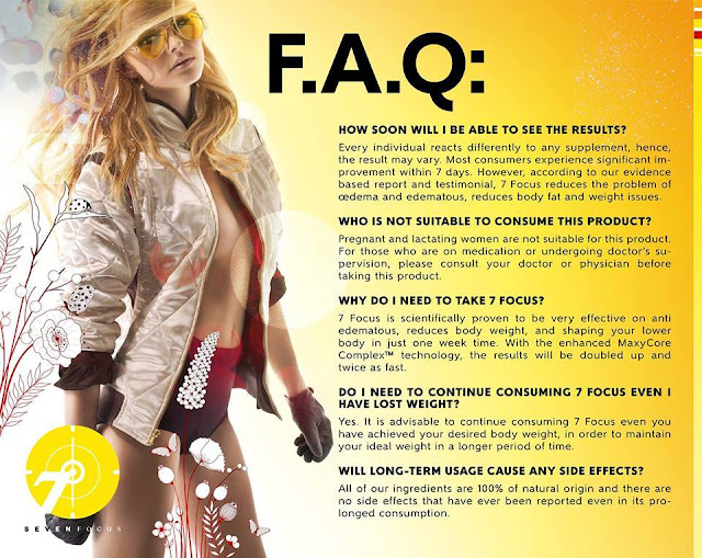 A: 7Focus is scientifically proven to be very effective on anti-edematous, reduces body weight, and shaping your lower body in just one week time. With the enhanced MaxyCore Complex™ technology, the results will be doubled up and twice as fast. 7Focus 已經科學證明,是一種擁有抗水腫、減輕體重、以及能在短短一個星期內塑造您身材的健康輔助品。再加上 MaxyCore Complex™ 高端技術的配合,其效果將會被大大提升而且更快速。
