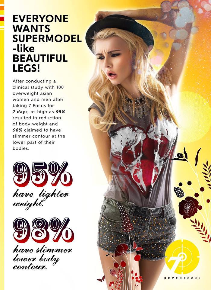 After conducting a clinical study with 100 overweight asian women and men after taking 7 Focus for 7 days, as high as 95% resulted in reduction of body weight and 98% claimed to have slimmer contour at the lower part of their bodies. 根據統計 100 位超重亞洲女性和男性的臨床驗證報告顯示,服用 7 Focus 七天後,95%服用者的體重下降,以及98%覺得下半身(腹部和腹部以下)有明顯的變瘦了。