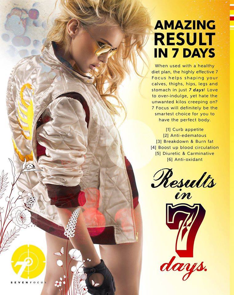 When used with a healthy diet plan, the highly effective 7 Focus helps shaping your calves, thighs, hips, legs and stomach in just 7 days! Love to over-indulge, yet hate the unwanted kilos creeping on? 7Focus will definitely be the smartest choice for you to have the perfect body. 當您服用 7Focus 時,只要再加上健康的飲食習慣,您將能在短短的 7 天內輕鬆塑造完美小腿、大腿、臀部、腿部和腹部。如果您偶爾想要放縱自己,但又擔心自己變胖,服用 7Focus 將是您最明智的選擇。