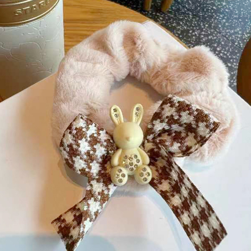 千鸟格蝴蝶结大肠发圈镶钻小熊兔子甜美风发绳网红气质奶茶色发饰