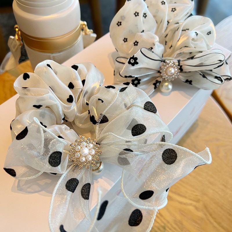 法式气质网纱蝴蝶结大肠发圈ins韩系简约缎面波点发绳仿珍珠发饰
