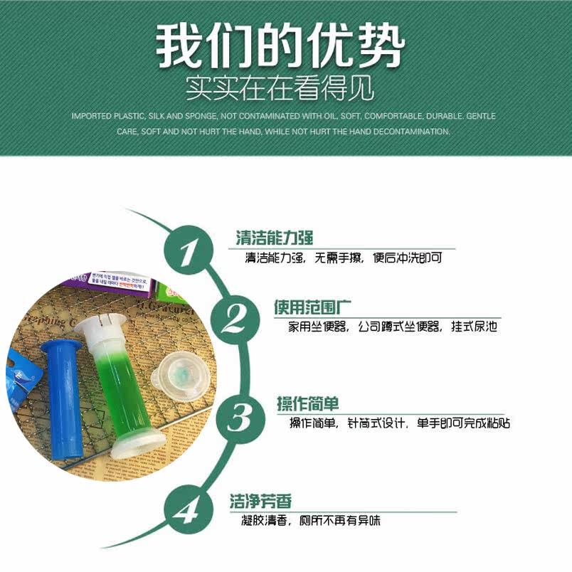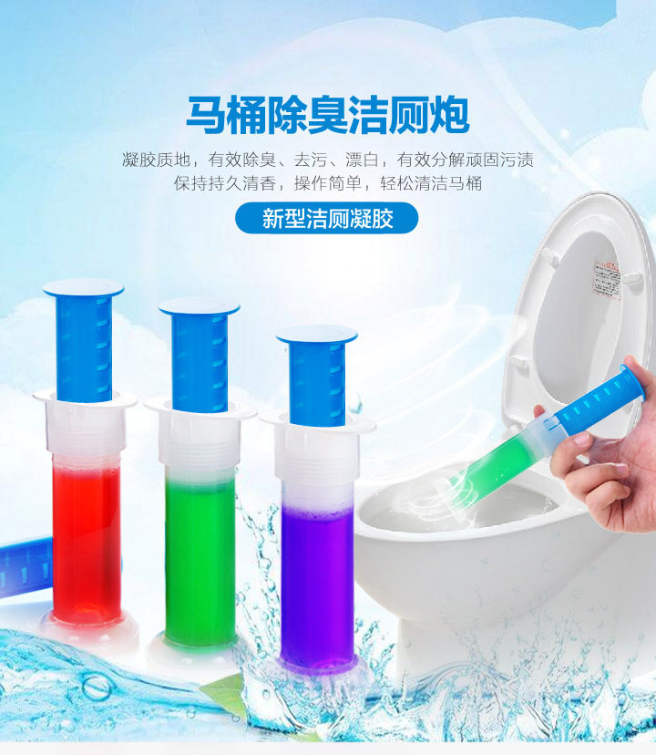 使用起来方便又简单:只需将炮管对准马桶内壁,轻轻一推,一朵可爱的玫瑰花型的凝胶产品就立刻紧紧粘贴在马桶壁上。每次一冲水,凝胶即释放清洁泡沫,帮助清洁马桶;同时它会散发持久清香,让厕所时刻保持干净清新。每粒凝胶可冲水长达1周,一支洁厕炮内含6粒凝胶,可使用长达一个半月。洁厕炮使用方式和外形也颇具独到之处,从中可以感受到创新科技为提高生活质量的重要性和无限魅力。在当今倡导高品质生活的同时,生活中不仅需要的是高效能的产品,还要它够便捷,够卫生。洁厕炮不仅解决了平时处理清洁的尴尬,也使家庭清洁更省力省心。