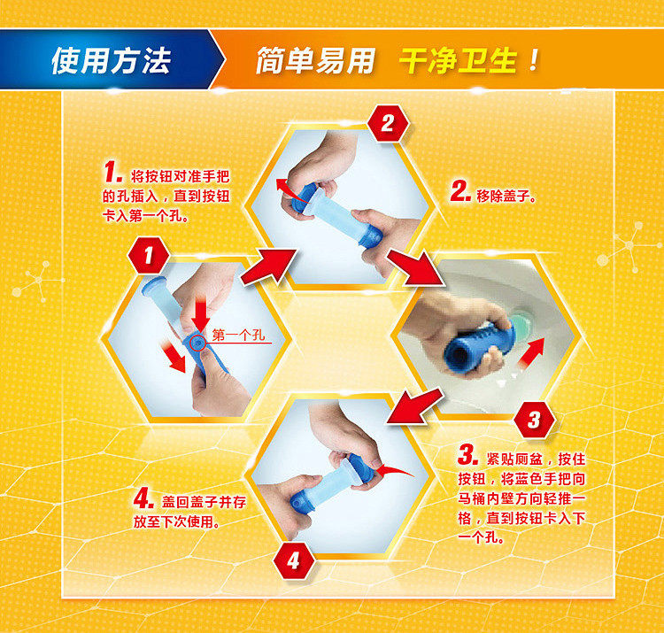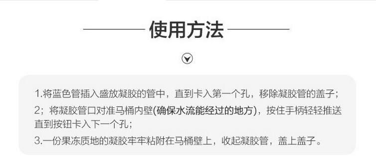对于日常用厕产生的污垢,洁厕炮在使用的过程中,会释放清洁泡沫,它的清洁能力足以应付。使用了洁厕炮,每天使用厕所后,在冲水的同时就帮你进行清洁,可以有效防止污垢的沉积。产品在上市之前经过了严格的公司内部检测及第三方的检测。检测结果表示:一般家庭使用,只要您按照使用说明使用,每一次打一颗凝胶在马桶内壁,一支洁厕炮可冲水长达500次(按使用频率的不同,约为6周)。产品性质温和,对马桶釉面、下水道没有腐蚀。使用方法: